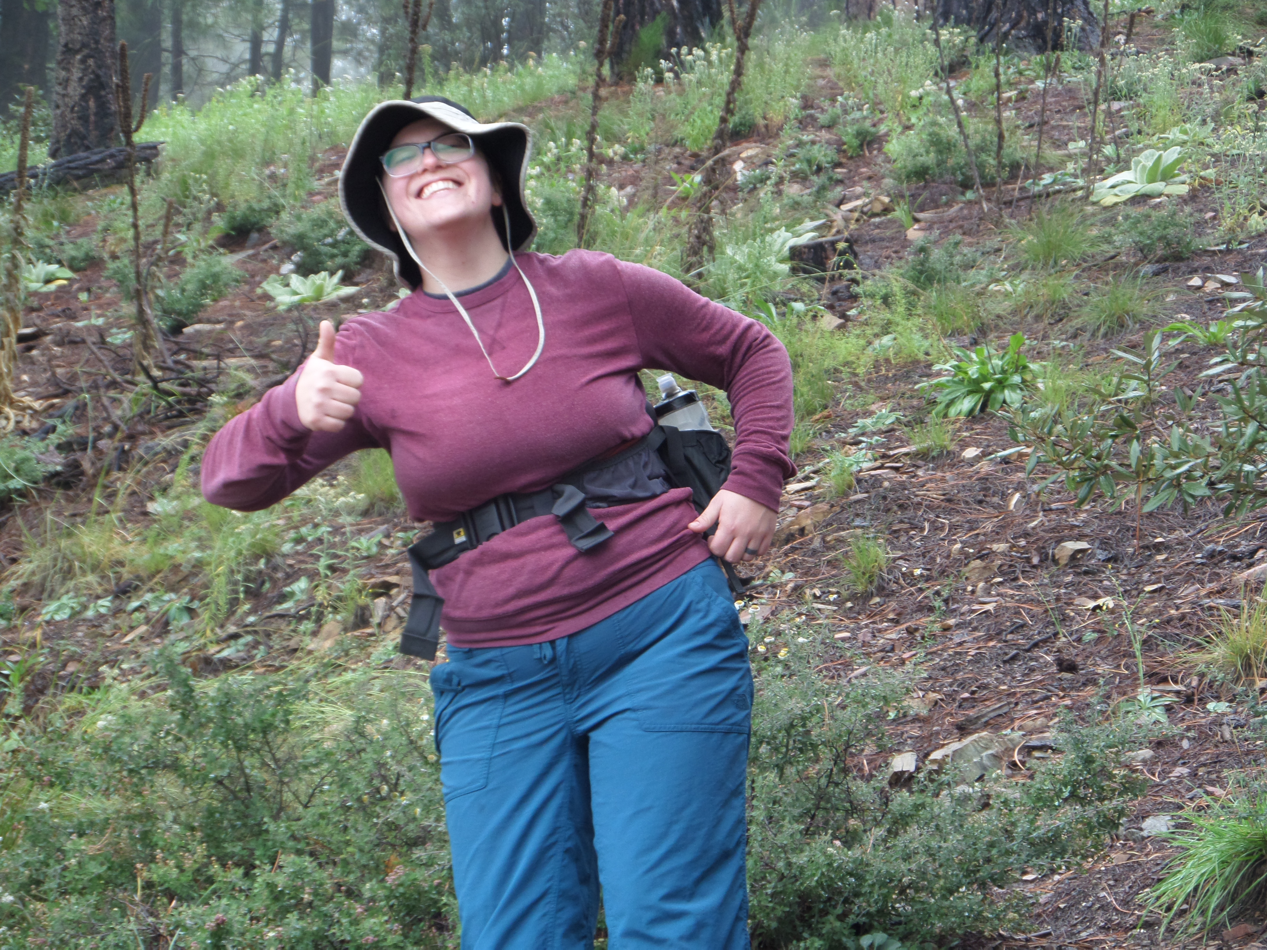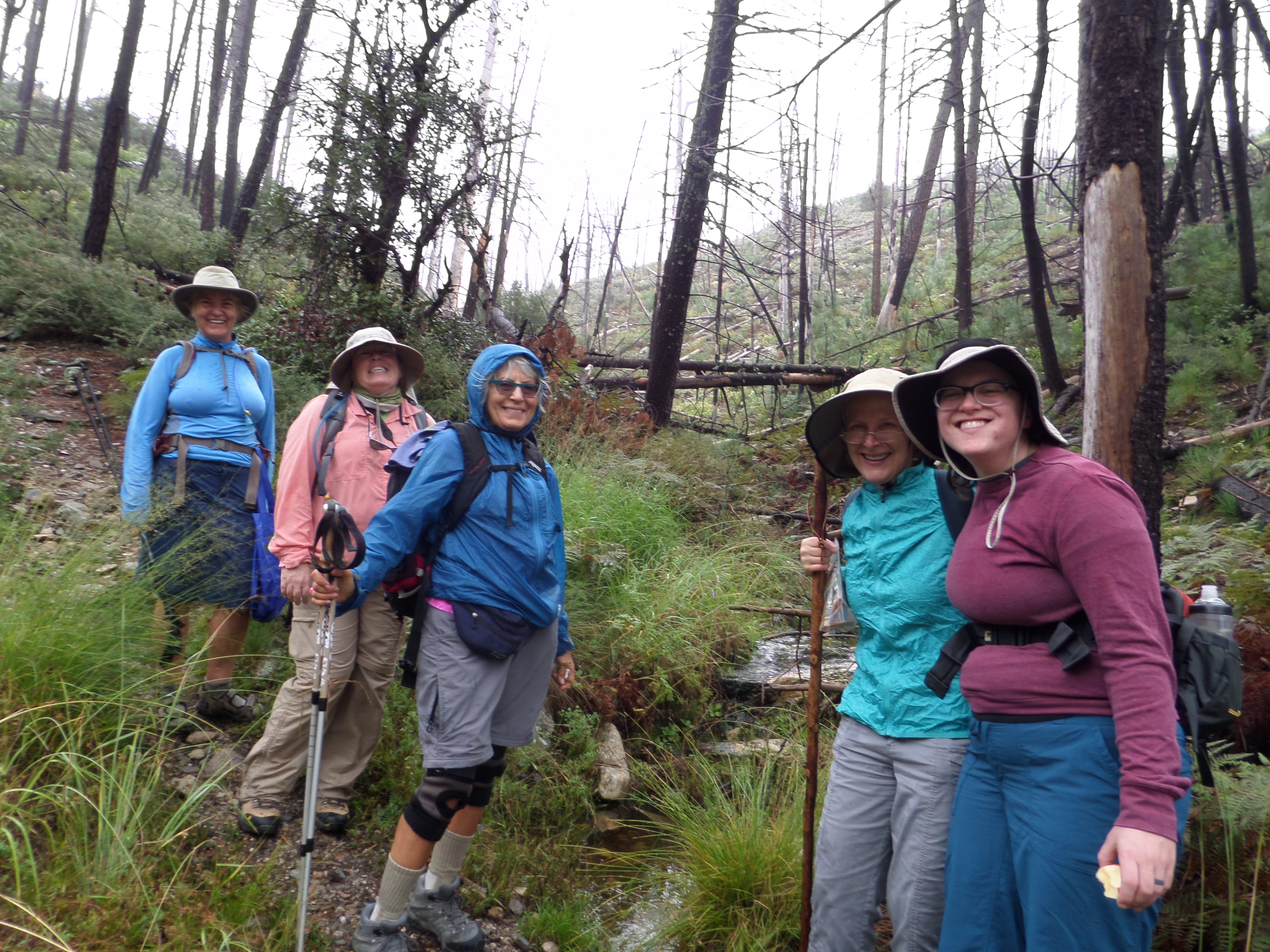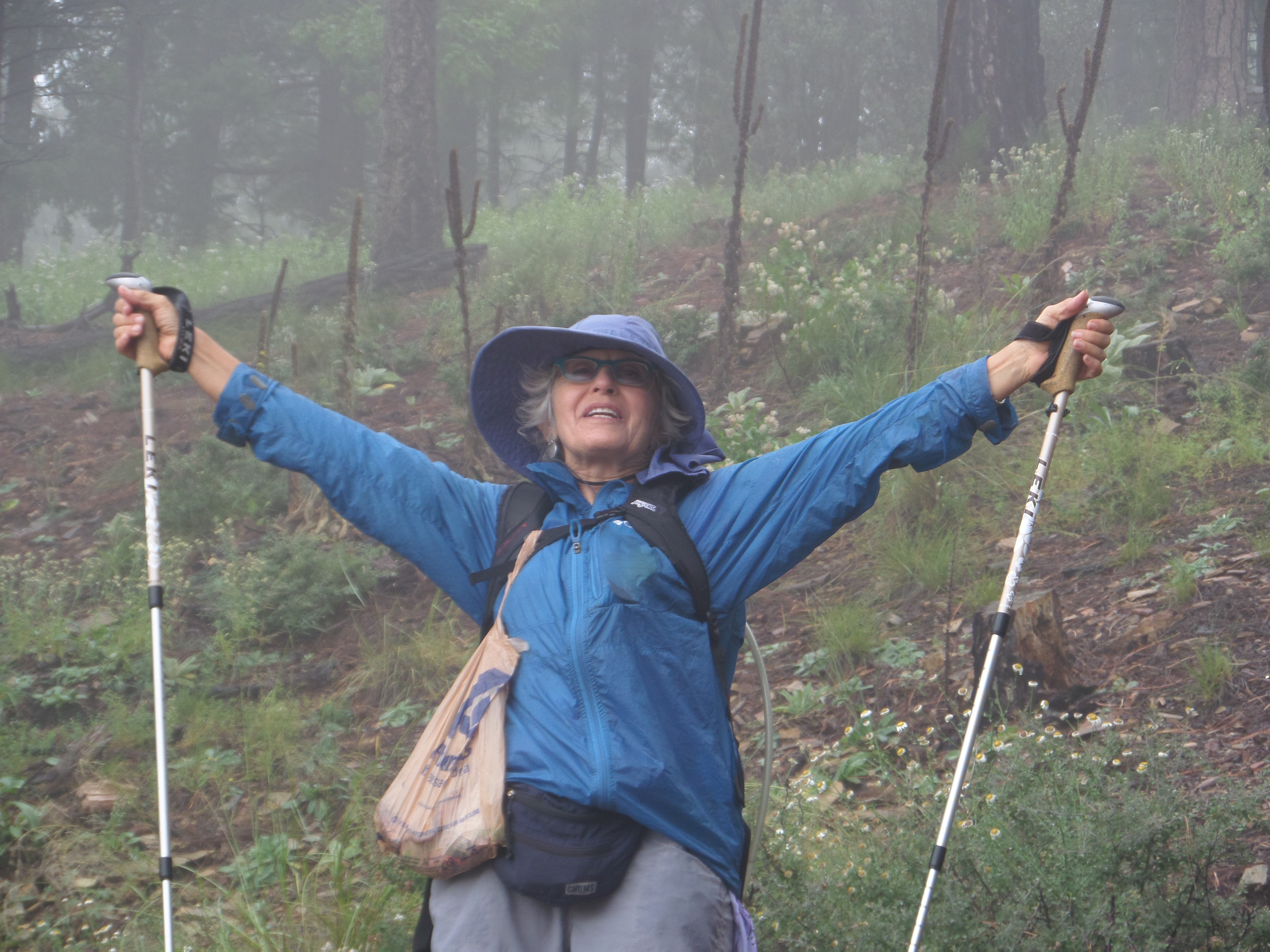 Then it began to pour rain, my hair was dripping into my eyes and my clothing was getting soaked. Well short of my lack of head wear, we all were in the same predicament. We finally made it to the trailhead and the car when the rain stopped and the sun came out.