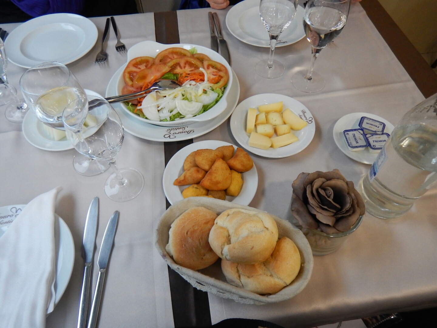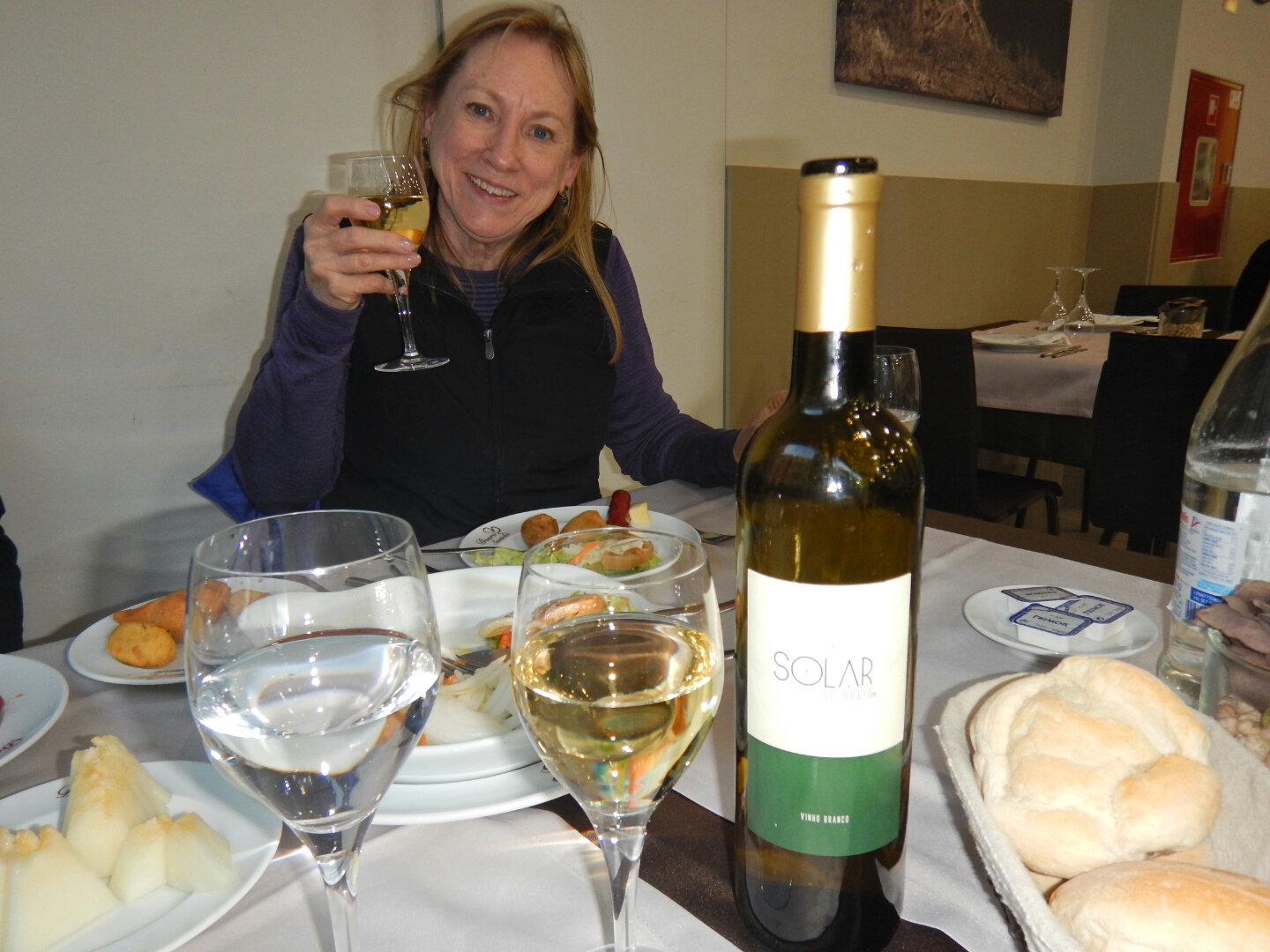 We entered the restaurant to find a lovely table by the window reserved for us, Shortly after we were seated the waiter came with a bottle of white wine for us – fortunately we all love the vinho Branca and a plethora of small bites or as they are called here in Europe ‘entrees’.