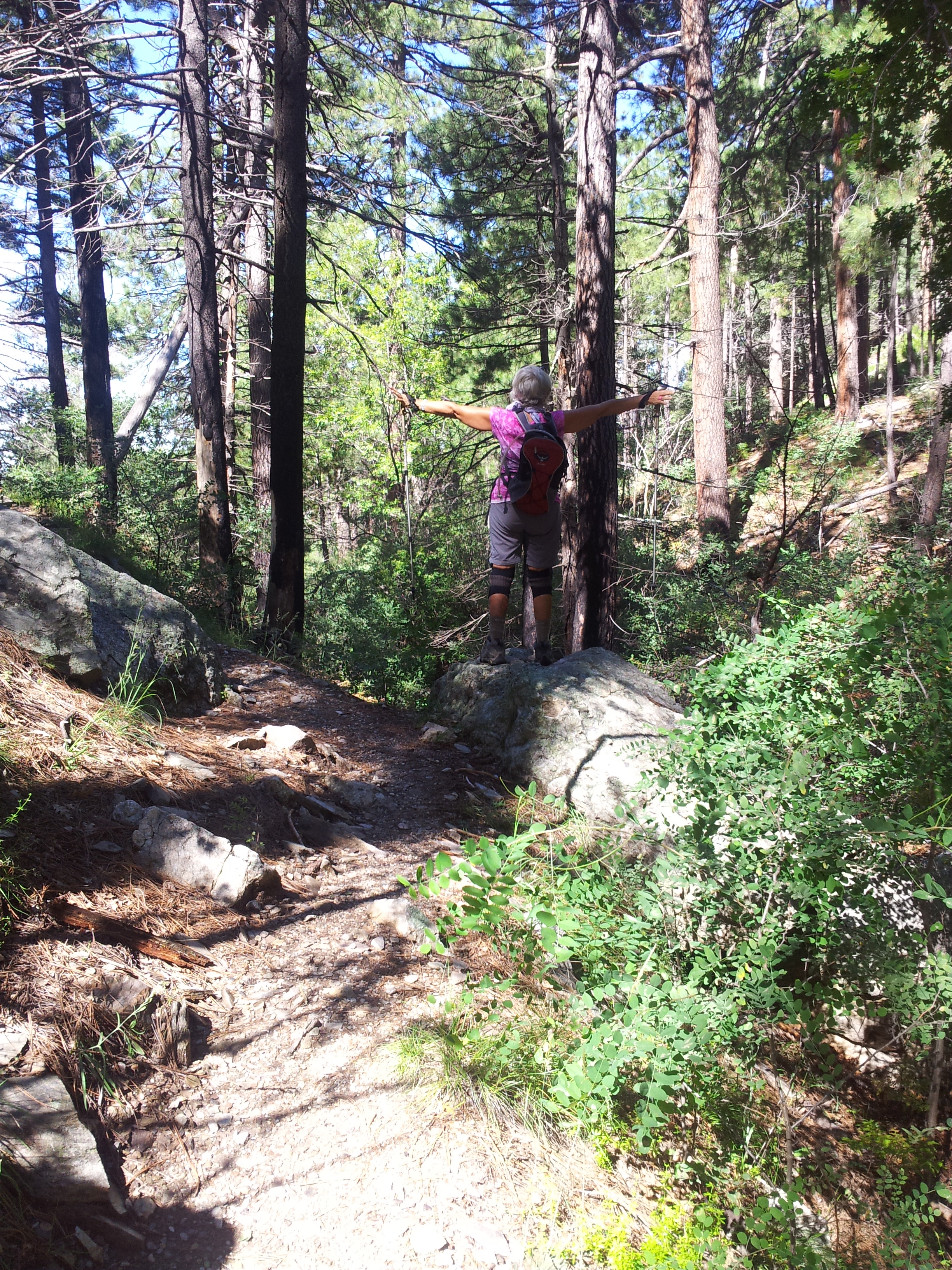 We continued on the trail, the air was cool, the lighting was perfect, the smells of the pine trees was intoxicating. The next thing I knew Sue was posing for a picture standing atop a huge rock.