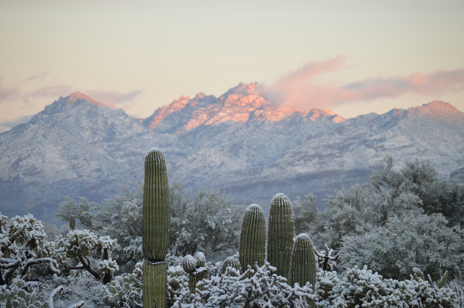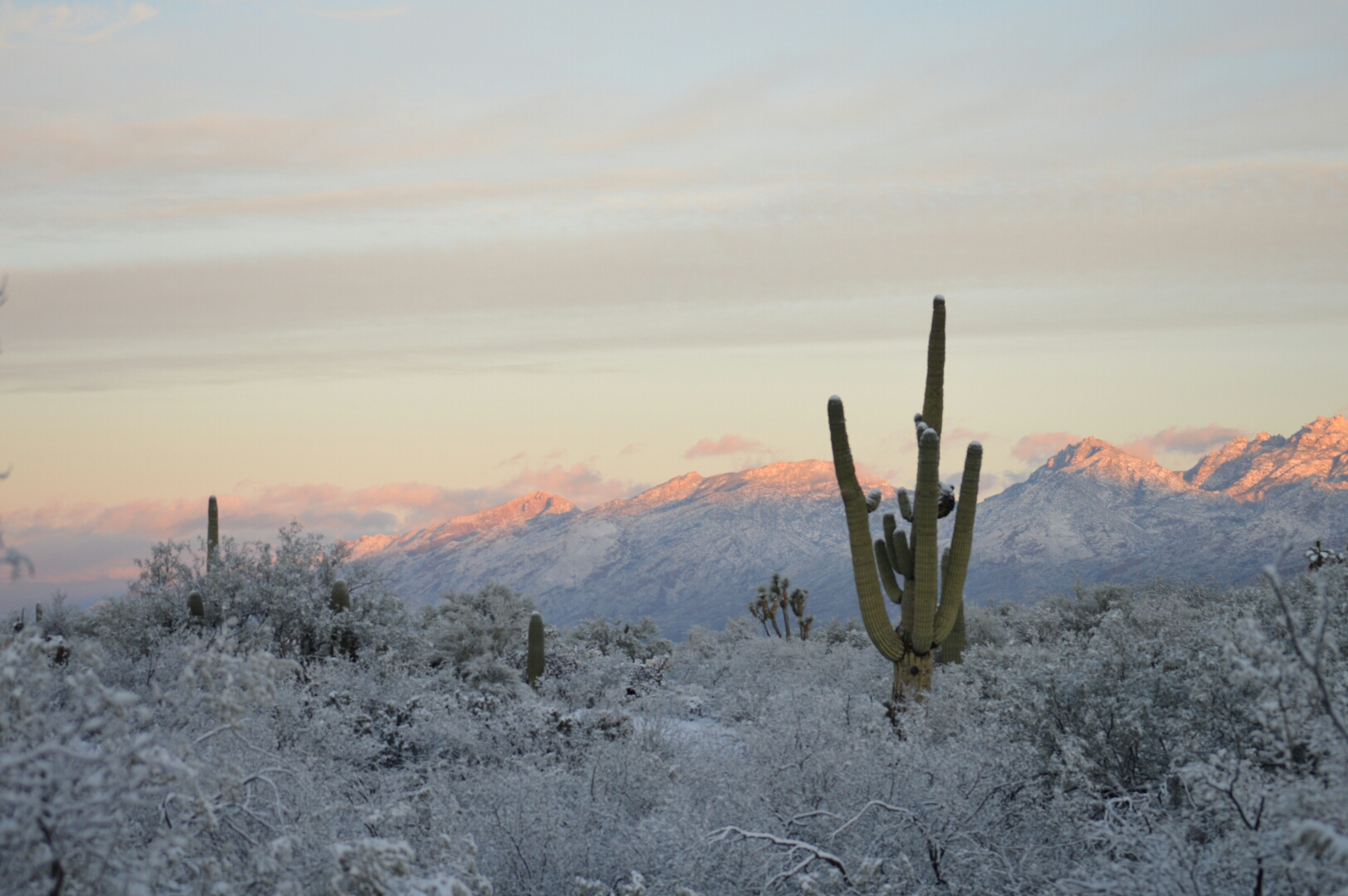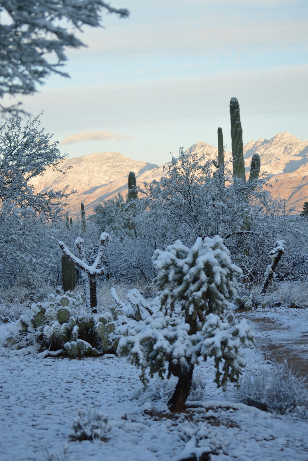 I entered Saguaro National Park and the trail I so frequently hike had turned into a winter wonderland overnight. I took 120 pictures and would have probably taken 120 more had my gloved hands not become so cold that I decided to make my way back to the trailhead and the warmth of my car. On the way back I passed quite a few others toting their cameras, snow in the desert is quite a beautiful thing.
