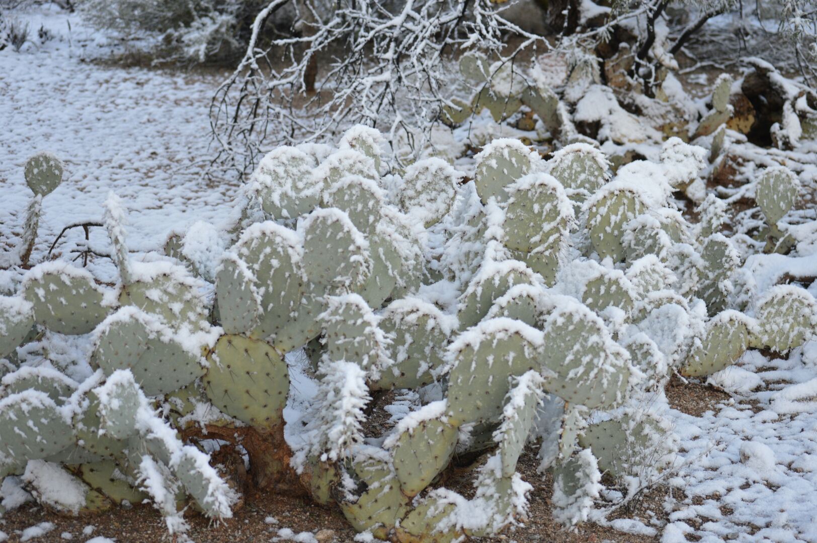 I have wanted to get some pictures of snow on the cacti and now was my chance. I jumped up, quickly threw on some sweat pants, my medium weight Smartwool long sleeve shirt, hiking socks and my hiking boots. I grabbed my camera, changed the lens to the wide-angle 11-16 mm, packed my 55-200 mm into the camera case, grabbed my gloves, put a buff around my neck and zipped up my fleece jacket. Out to the garage I headed. Oops – I forgot to take my first cup of java which I had put into the travel mug so I went back into the house to retrieve the mug full of my morning energy.